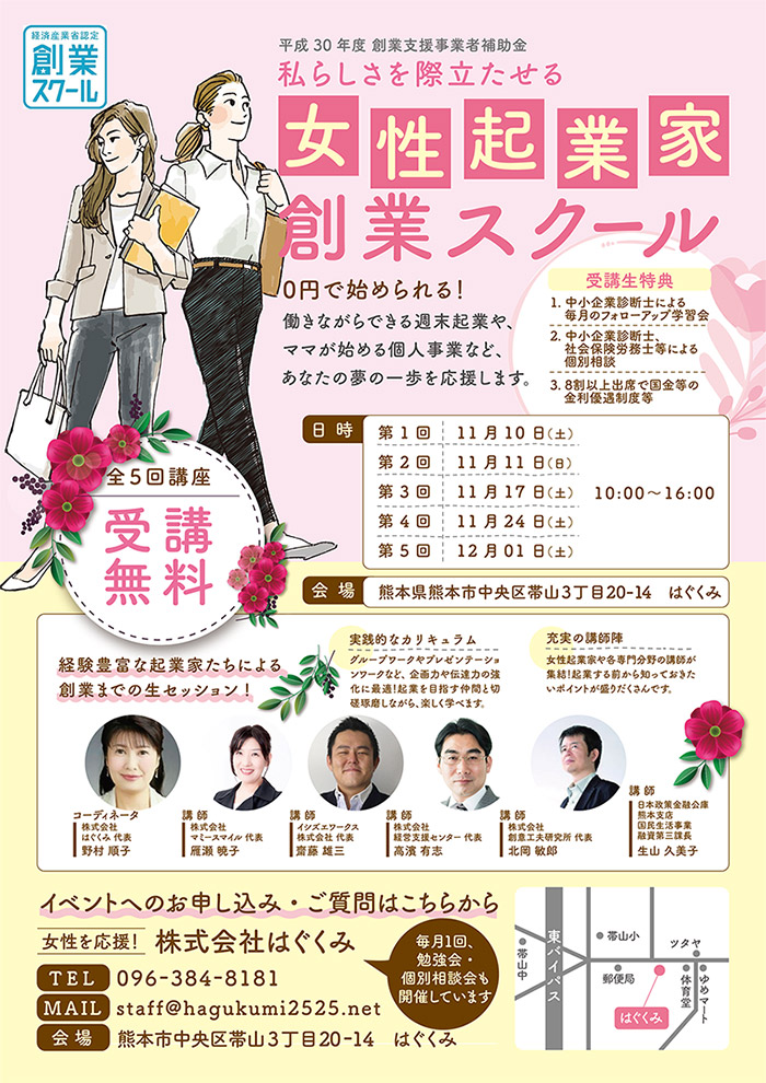 • 平成30年度は『女性起業家スクール』と毎月のフォローアップ研修、社労士などによる事業相談会を実施予定。