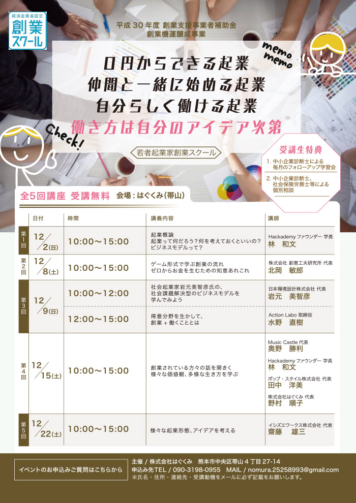 30年1月より中小企業庁熊本県よろず支援拠点と連携し、月に1~2回の無料創業相談会を株式会社はぐくみの関連施設、はぐくみコミュで開催してもらえることとなりました。